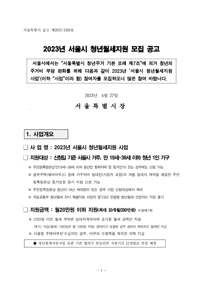 서울시에서는 “서울특별시 청년주거 기본 조례 제7조”에 의거 청년의 주거비 부담 완화를 위해 다음과 같이 2023년 ‘서울시 청년월세지원 사업’(이하 “사업”이라 함) 참여자를 모집합니다.