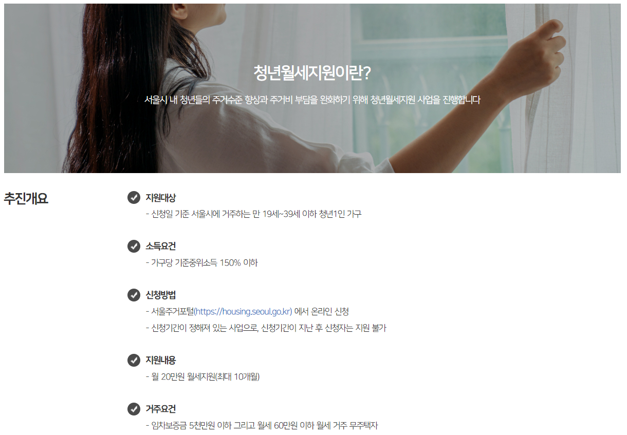 지원대상 : 신청일 기준 서울시 거주, 만 19세~39세 이하 청년 1인 가구