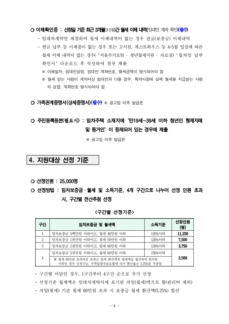 임차보증금, 월세 및 소득 기준 4개 구간으로 나누고 선정인원 초과시 구간별 전산 무작위 추첨/ 25,000명
