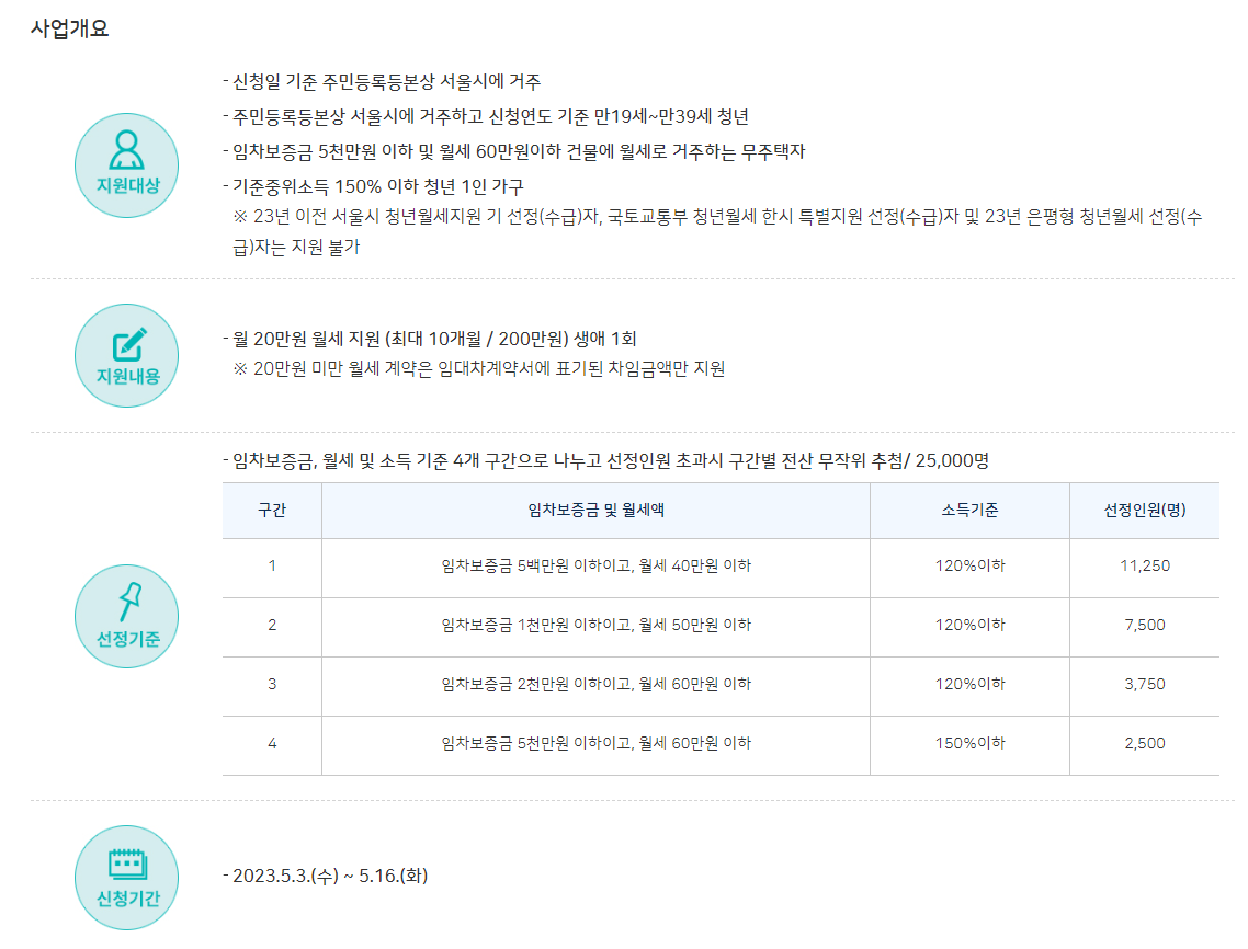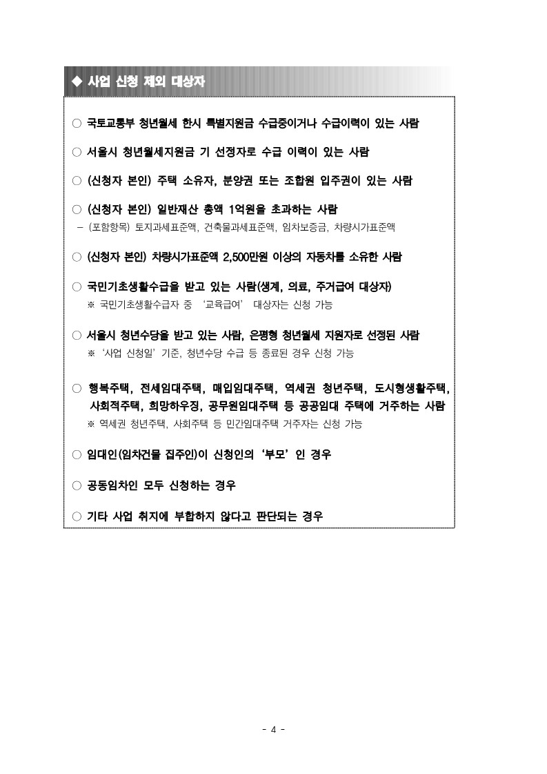 ※ 23년 이전 서울시 청년월세지원 기 선정(수급)자, 국토교통부 청년월세 한시 특별지원 선정(수급)자 및 23년 은평형 청년월세 선정(수급)자는 지원 불가