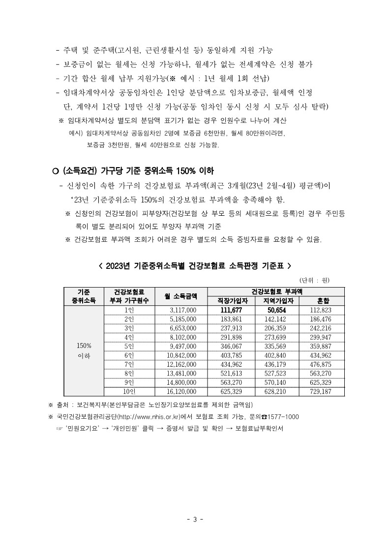 - 신청인이 속한 가구의 건강보험료 부과액(최근 3개월(23년 2월~4월) 평균액)이 ‘23년 기준중위소득 150%의 건강보험료 부과액을 충족해야 함.