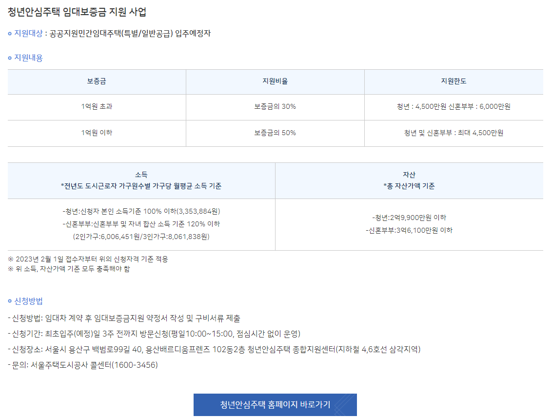 신청장소: 서울시 용산구 백범로99길 40, 용산배르디움프렌즈 102동2층 청년안심주택 종합지원센터(지하철 4,6호선 삼각지역)